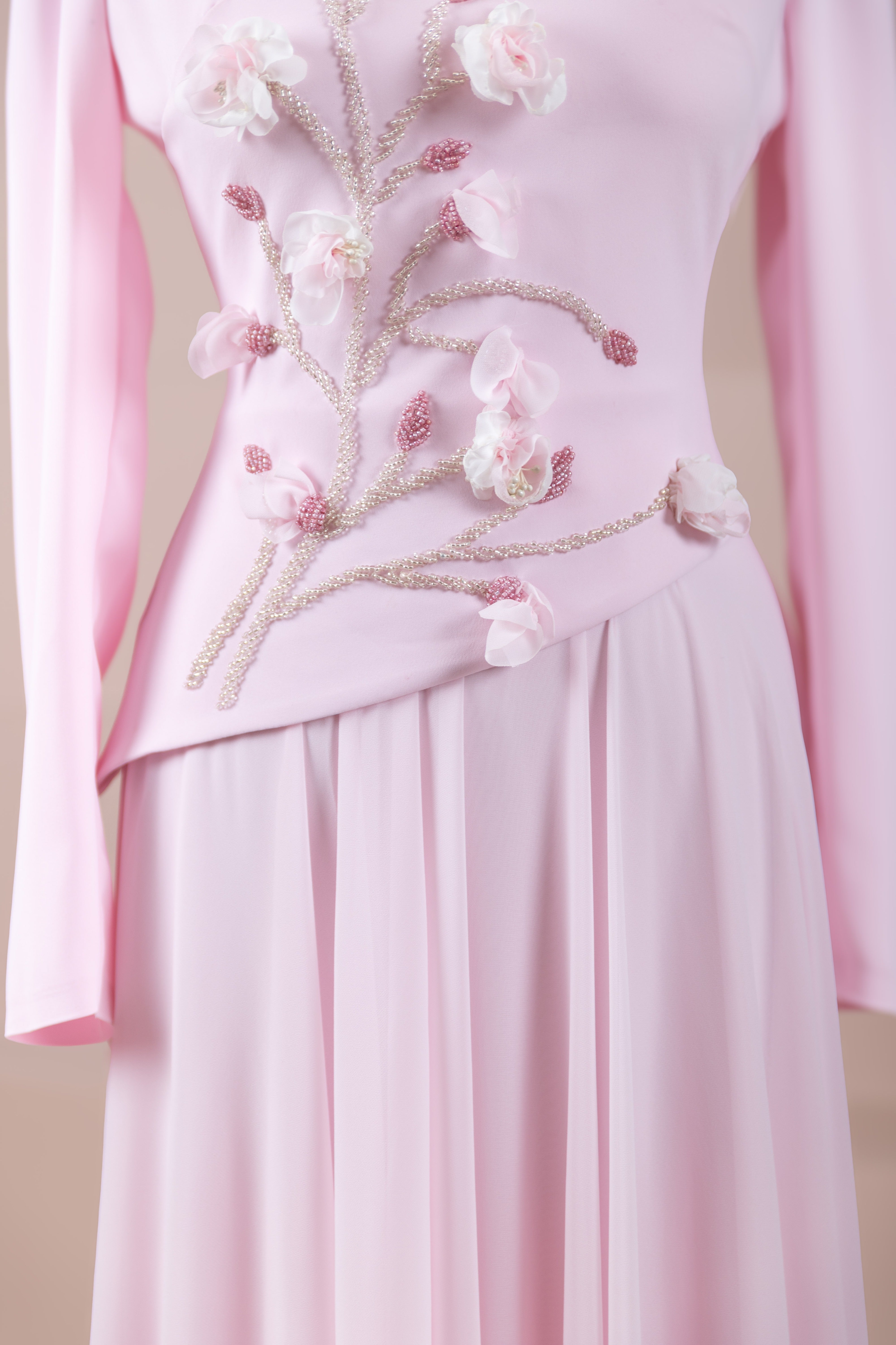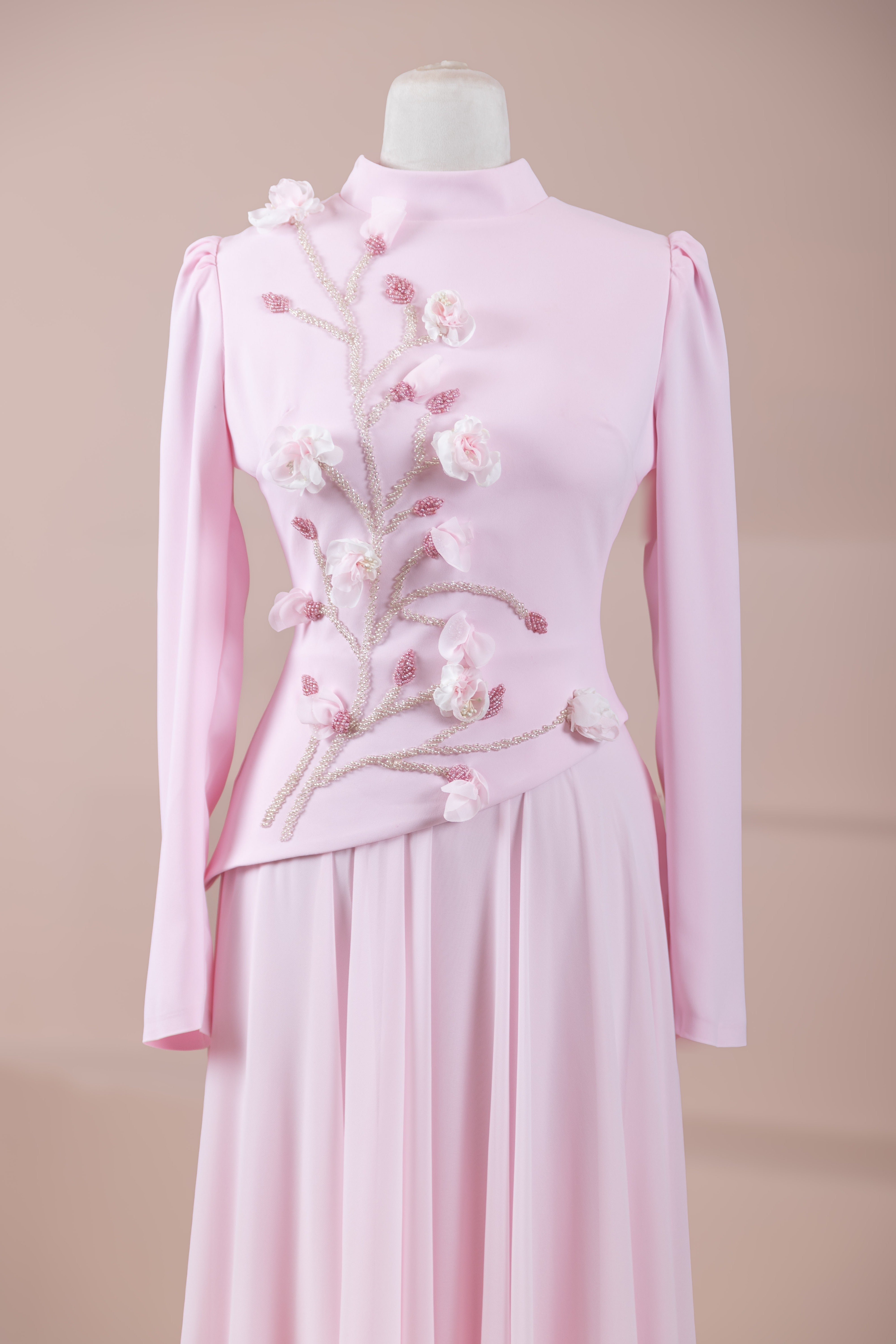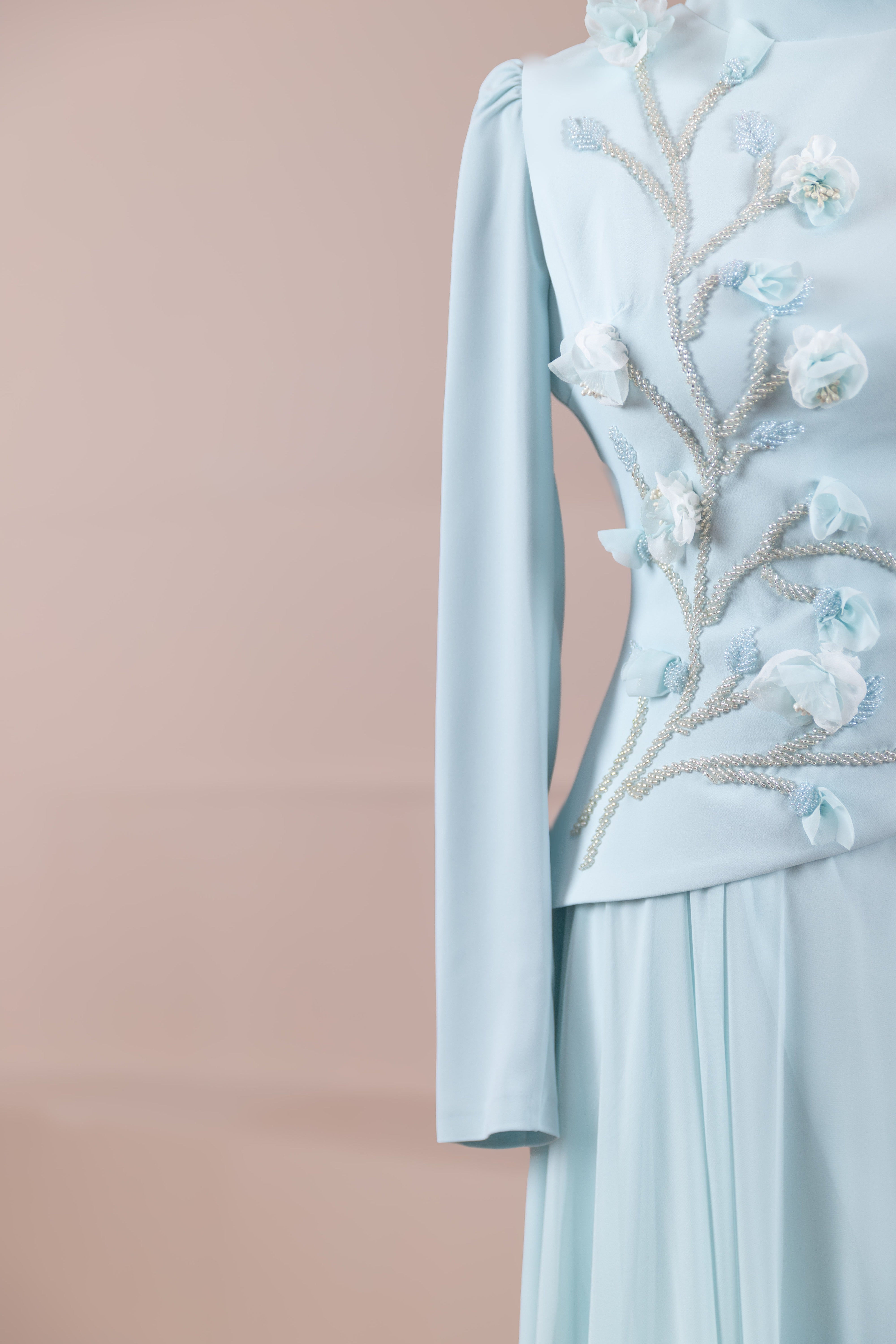 – Elegante Blumenmotive als Stickereien an Brust und Taille
