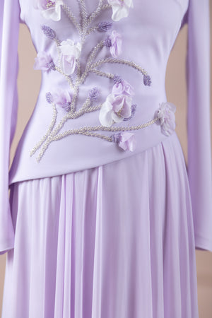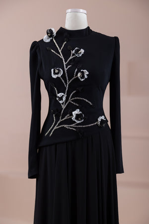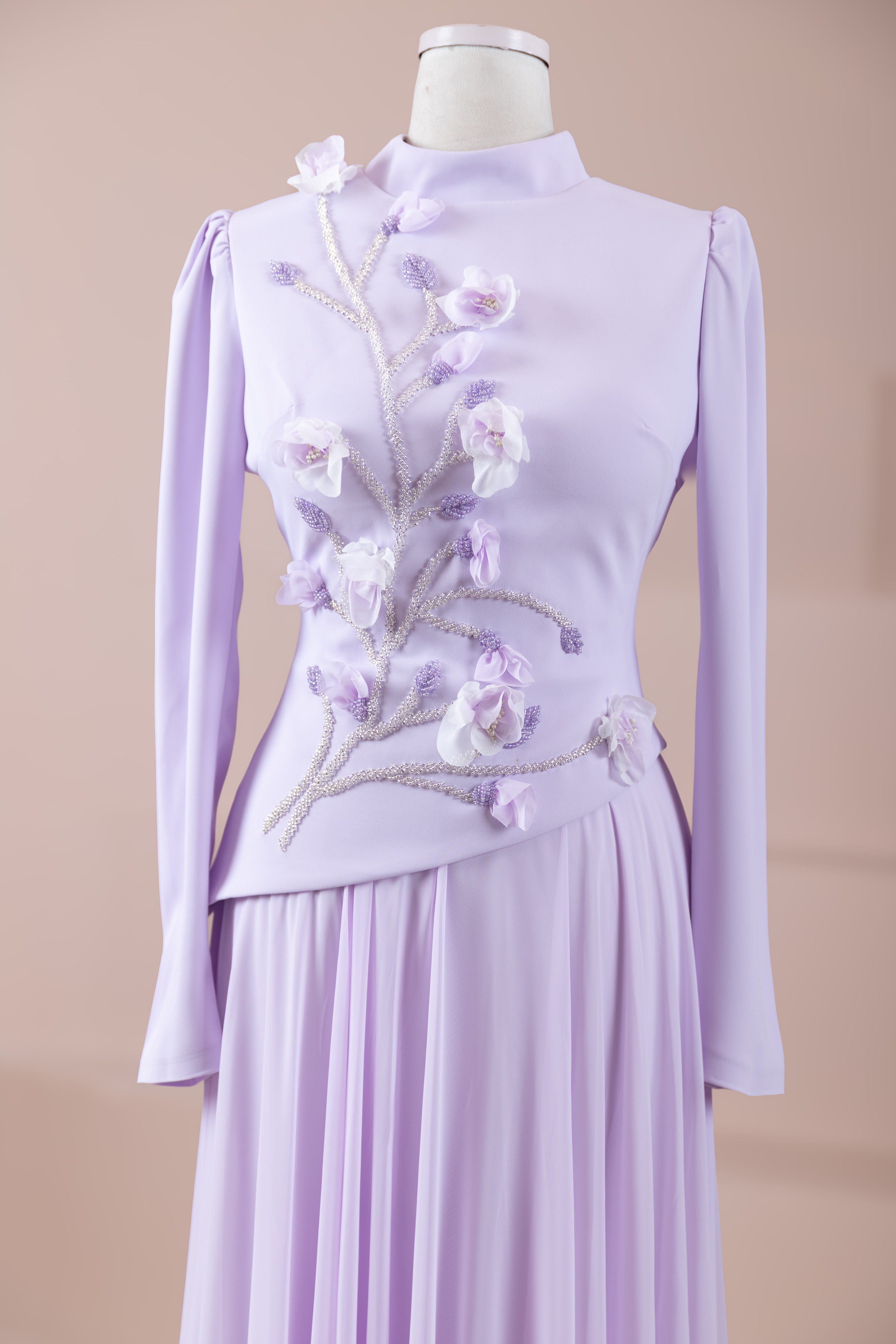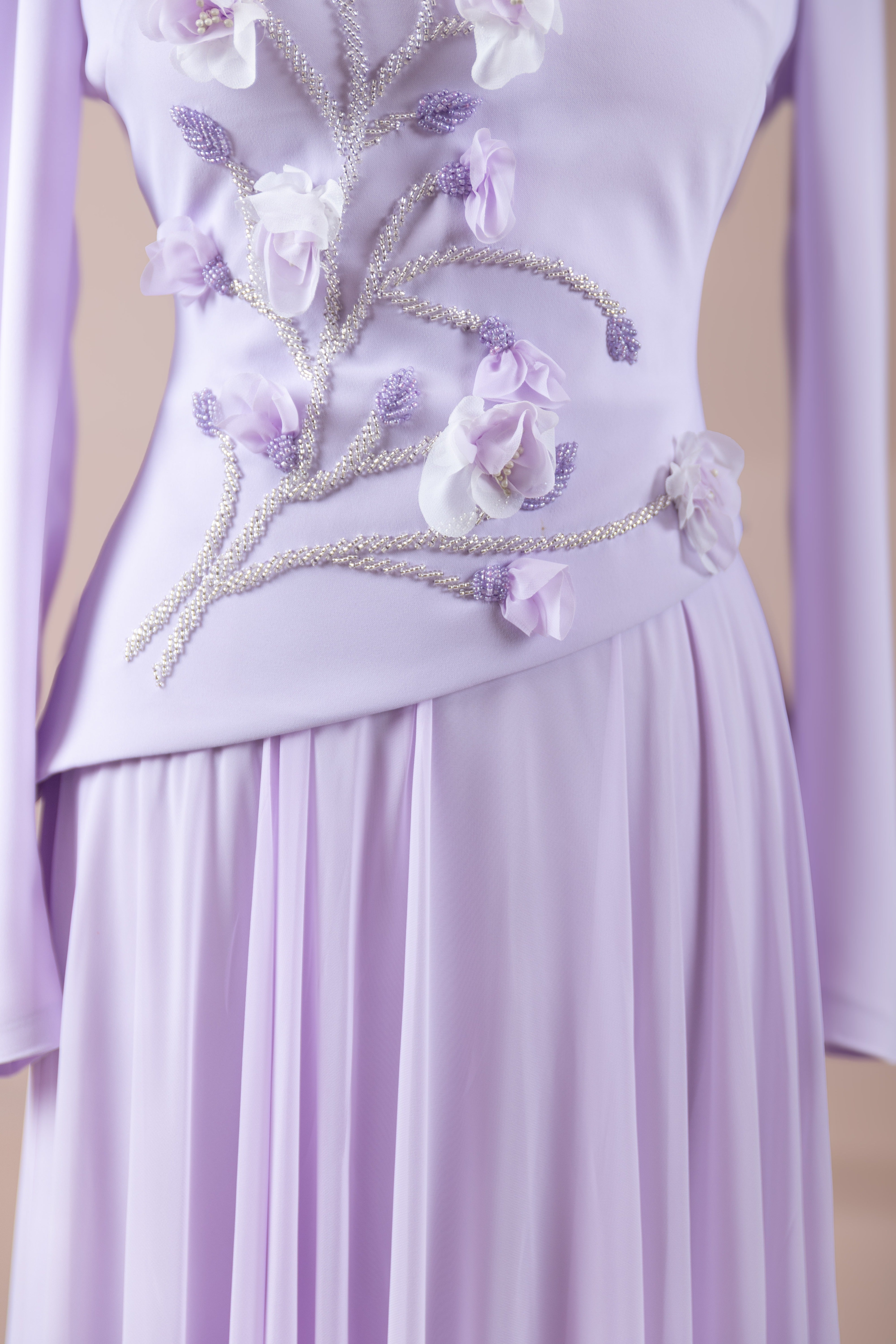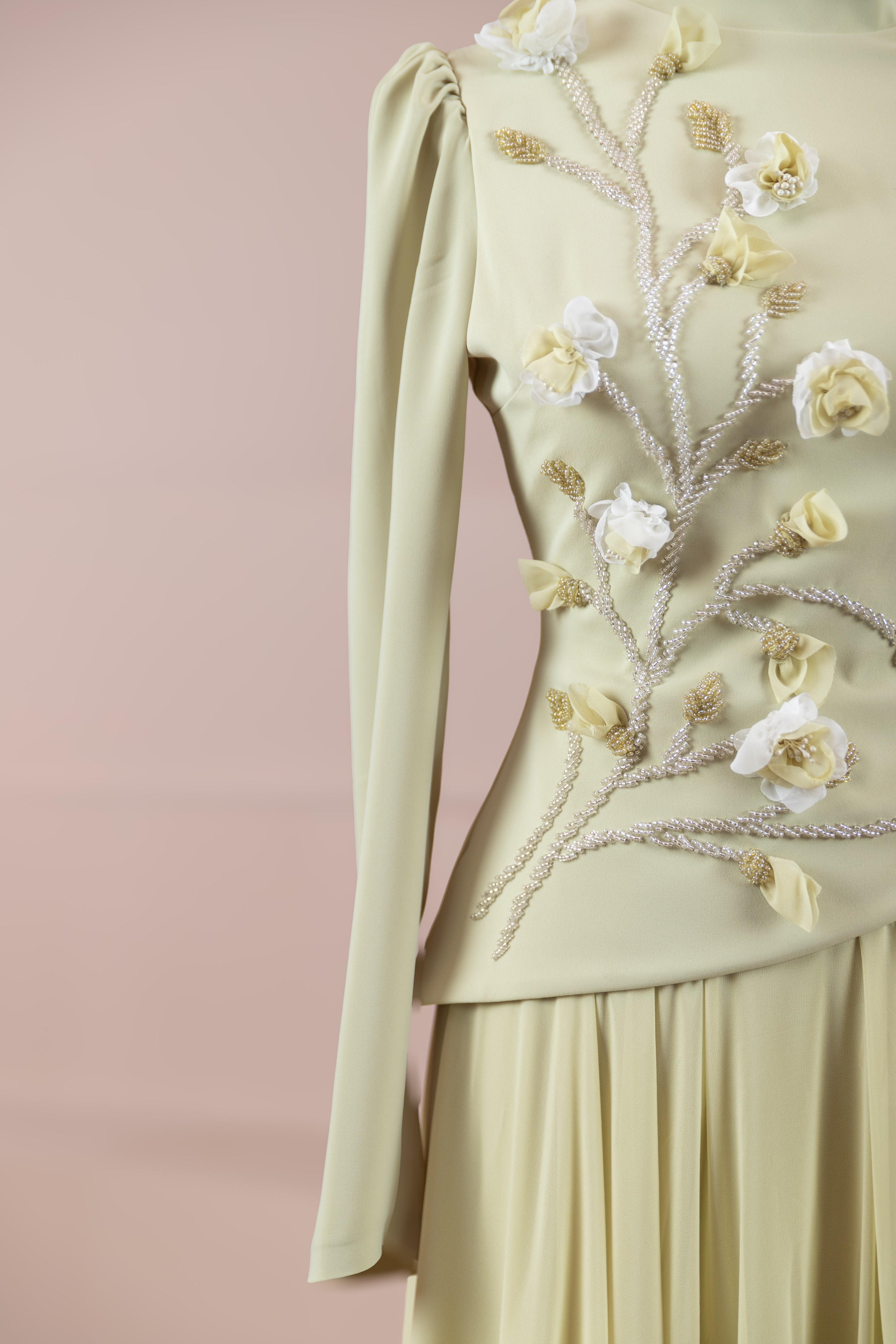 – Elegante Blumenmotive als Stickereien an Brust und Taille