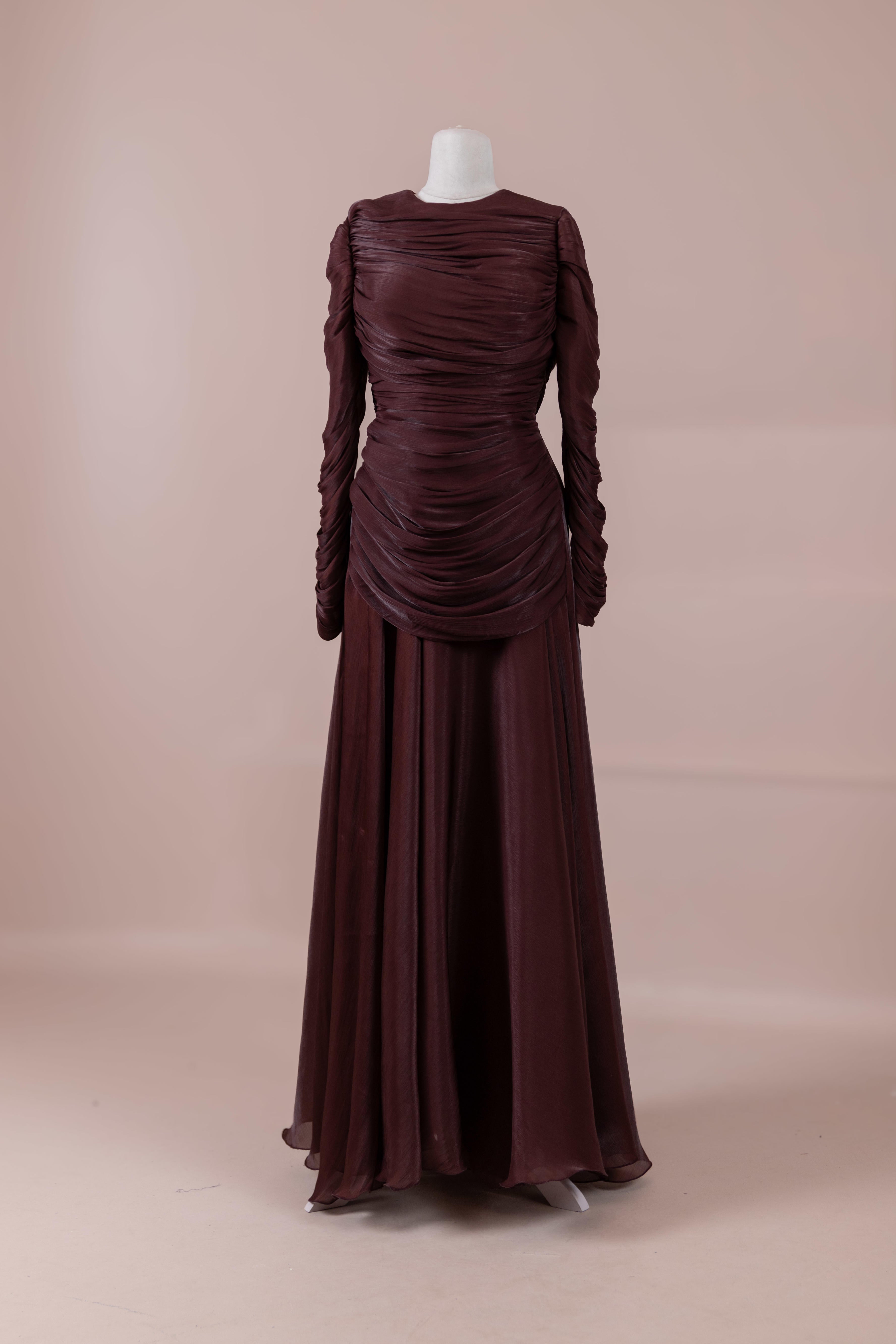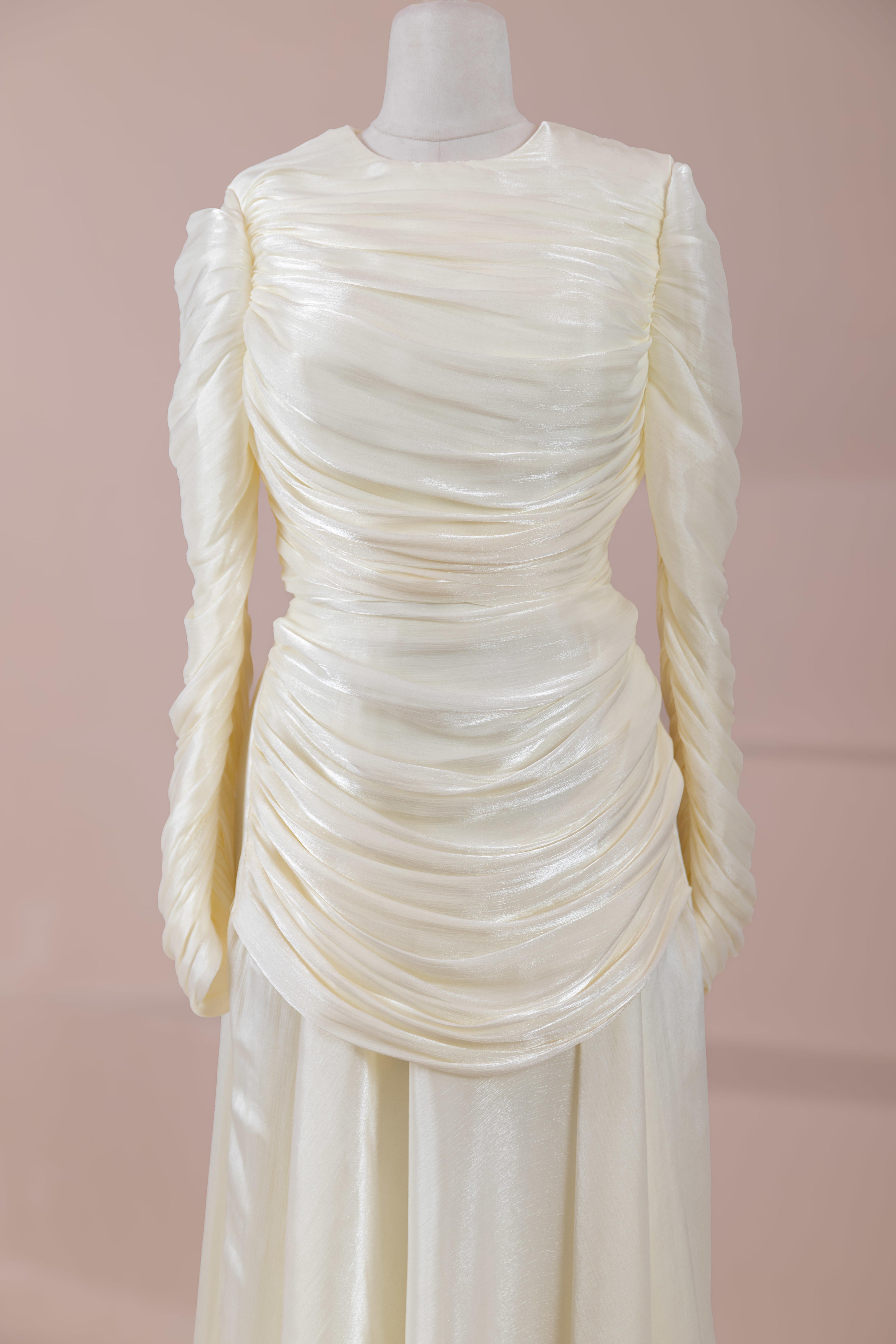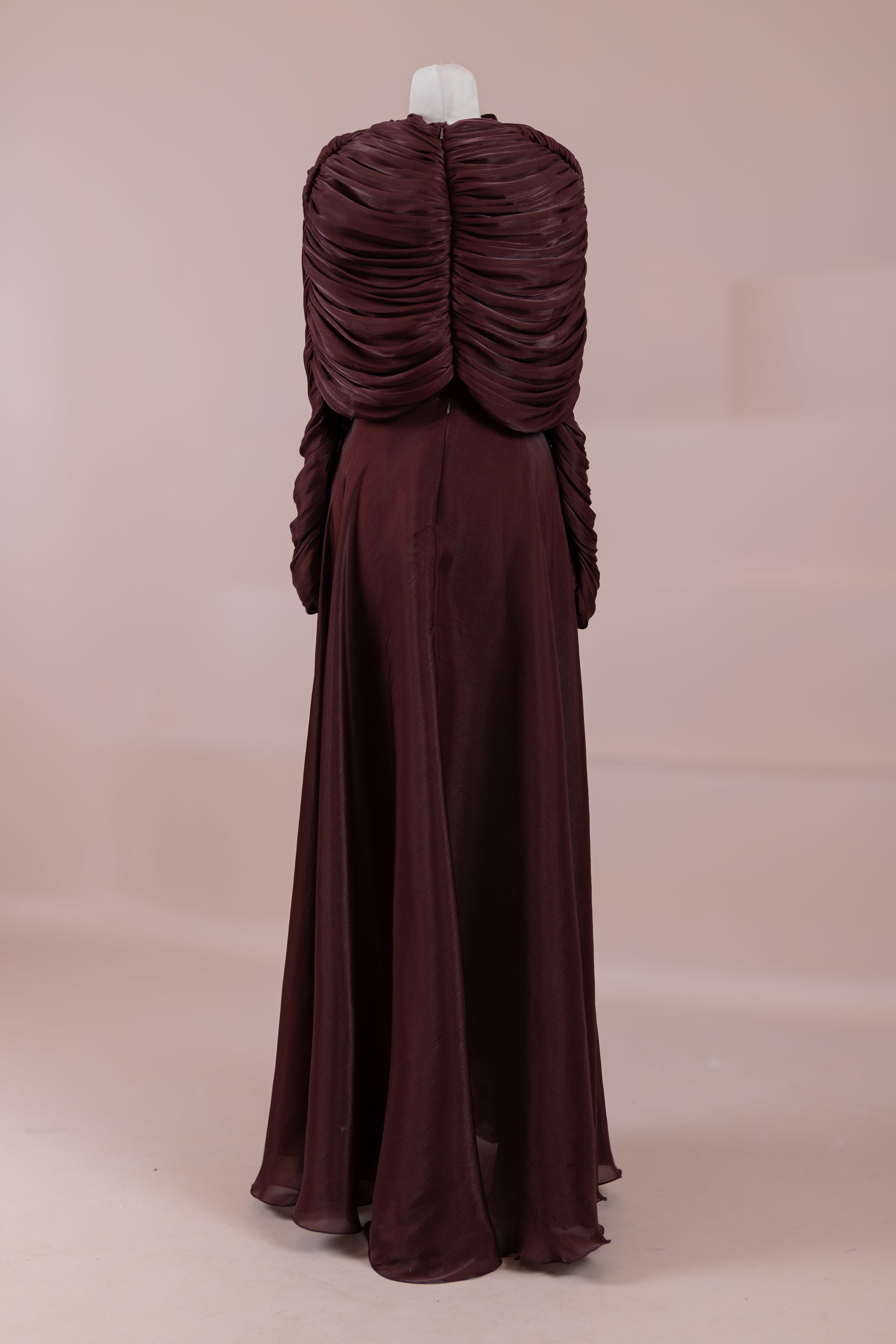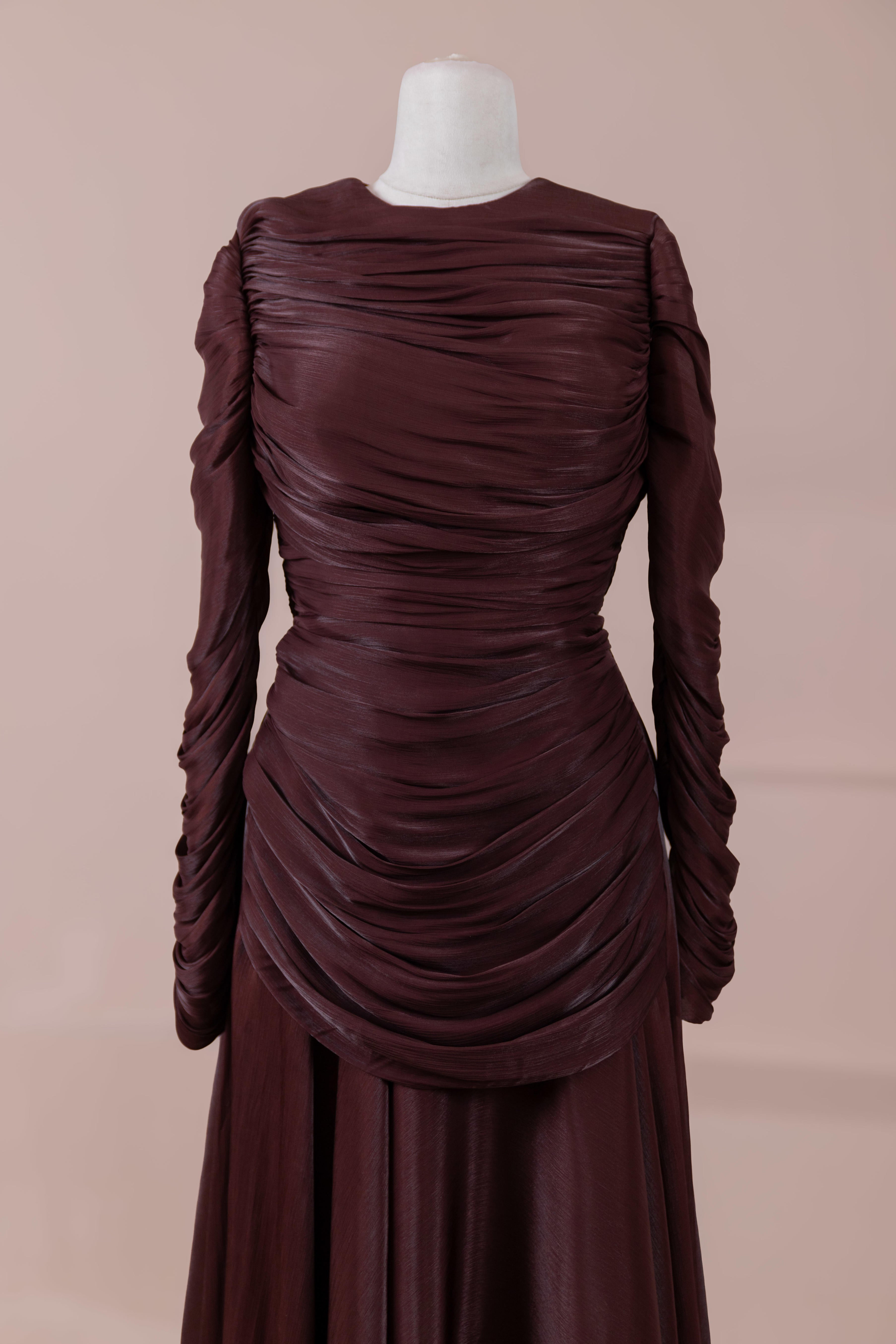 Das Modell hat eine zweilagige Konstruktion. Das Innenkleid ist in einer glatten und fließenden A-Linien-Form gestaltet; die Taille sitzt leicht anliegend, der Rockteil weitet sich natürlich zum Boden hin und erzeugt eine ausgewogene Silhouette. Das drapierte Teil im oberen Bereich beginnt an der Schulter und umschließt Rücken- und Brustbereich. Die Drapierungen sind horizontal und diagonal angeordnet, geben Volumen und sorgen für einen kontrollierten Fall, ohne die Form zu zerstören. Die Ärmellänge ist lang und reicht bis zum Handgelenk. Die Gesamtstruktur ist nach dem Prinzip eines vertikalen Flusses gestaltet, der den Körper länger und eleganter erscheinen lässt.