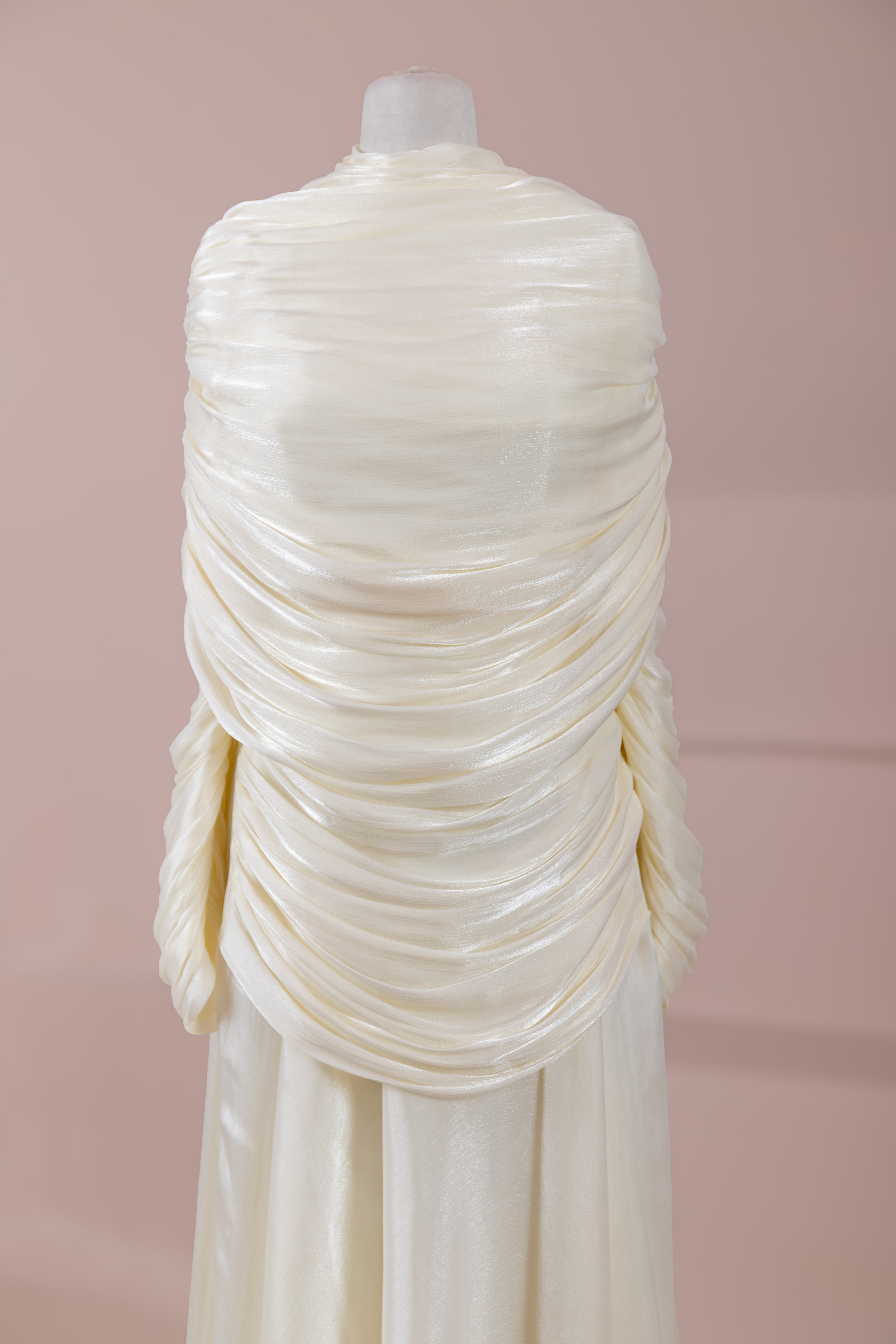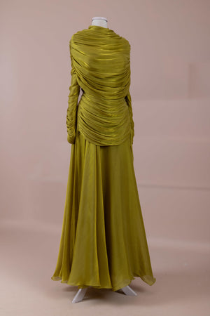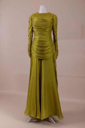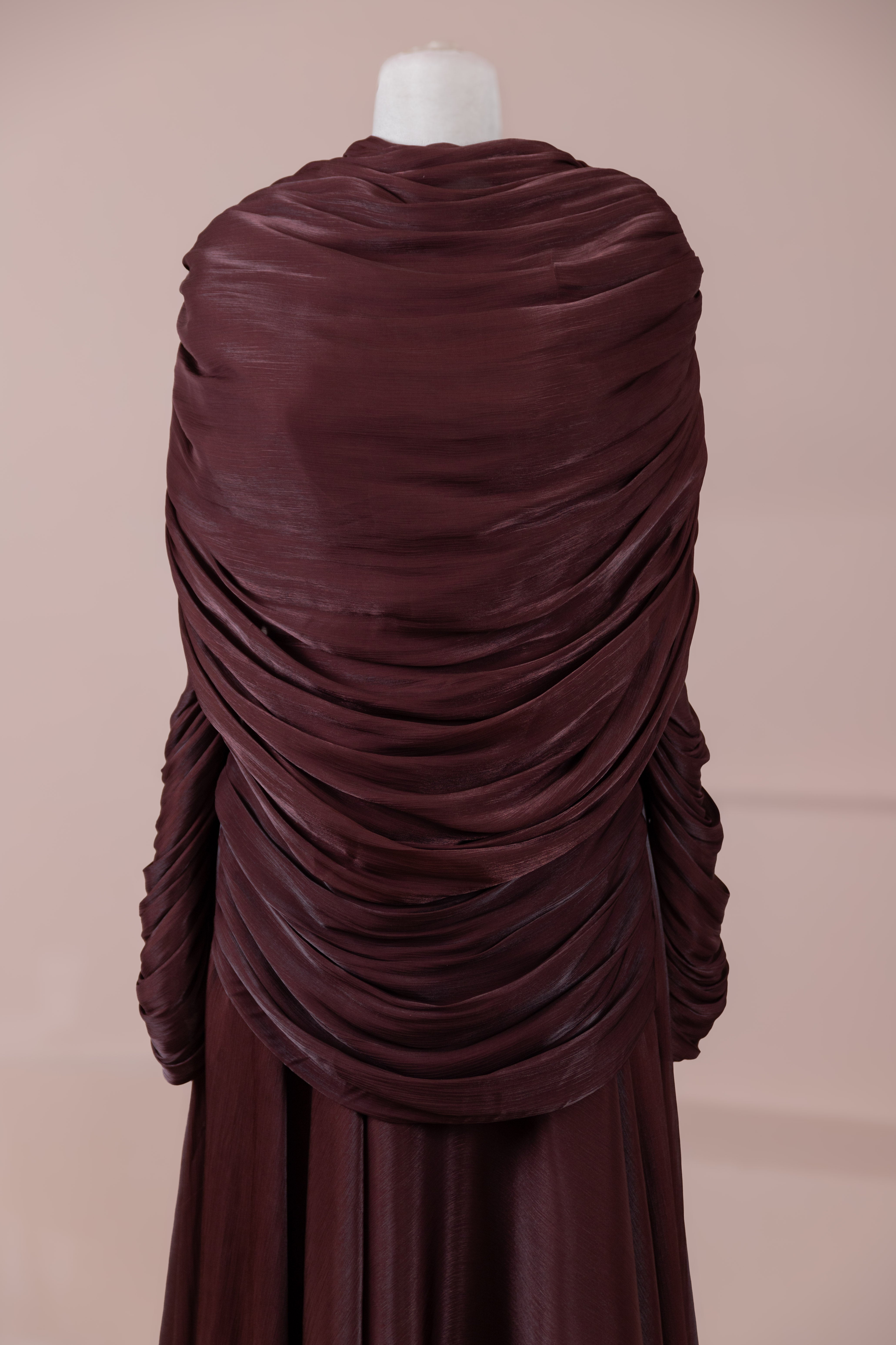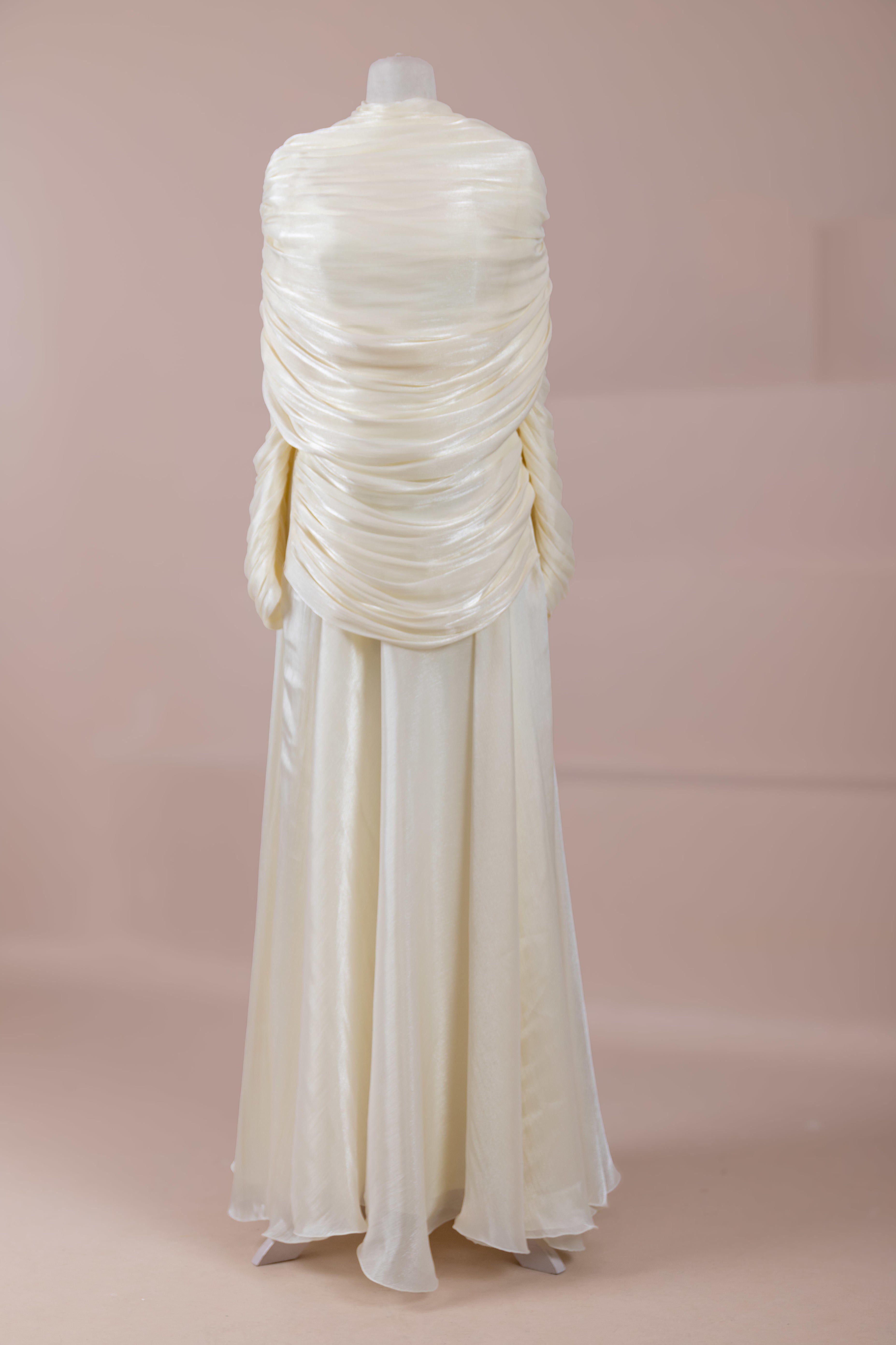 Das Modell hat eine zweilagige Konstruktion. Das Innenkleid ist in einer glatten und fließenden A-Linien-Form gestaltet; die Taille sitzt leicht anliegend, der Rockteil weitet sich natürlich zum Boden hin und erzeugt eine ausgewogene Silhouette. Das drapierte Teil im oberen Bereich beginnt an der Schulter und umschließt Rücken- und Brustbereich. Die Drapierungen sind horizontal und diagonal angeordnet, geben Volumen und sorgen für einen kontrollierten Fall, ohne die Form zu zerstören. Die Ärmellänge ist lang und reicht bis zum Handgelenk. Die Gesamtstruktur ist nach dem Prinzip eines vertikalen Flusses gestaltet, der den Körper länger und eleganter erscheinen lässt.