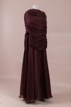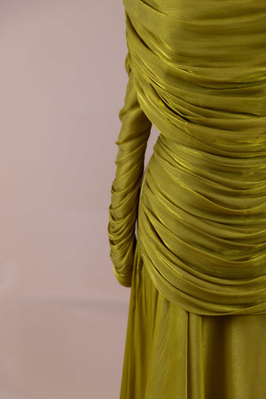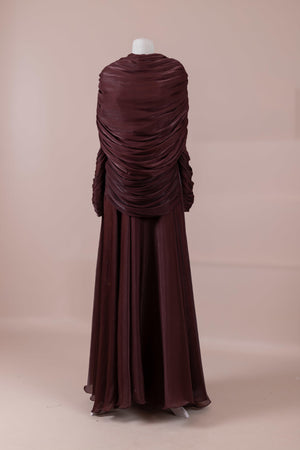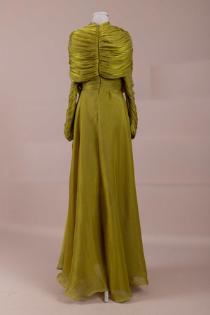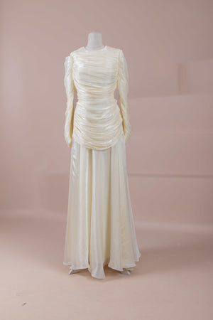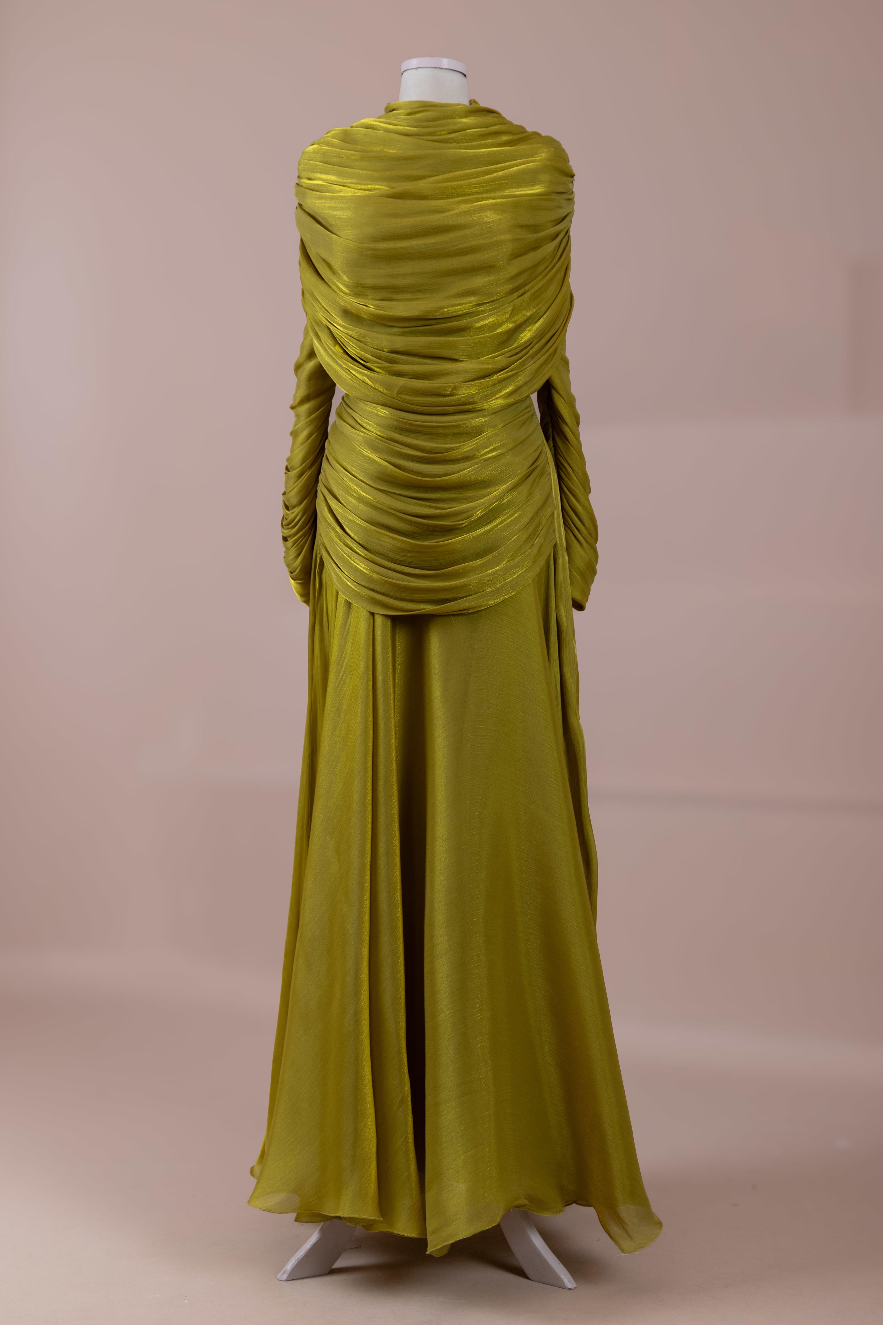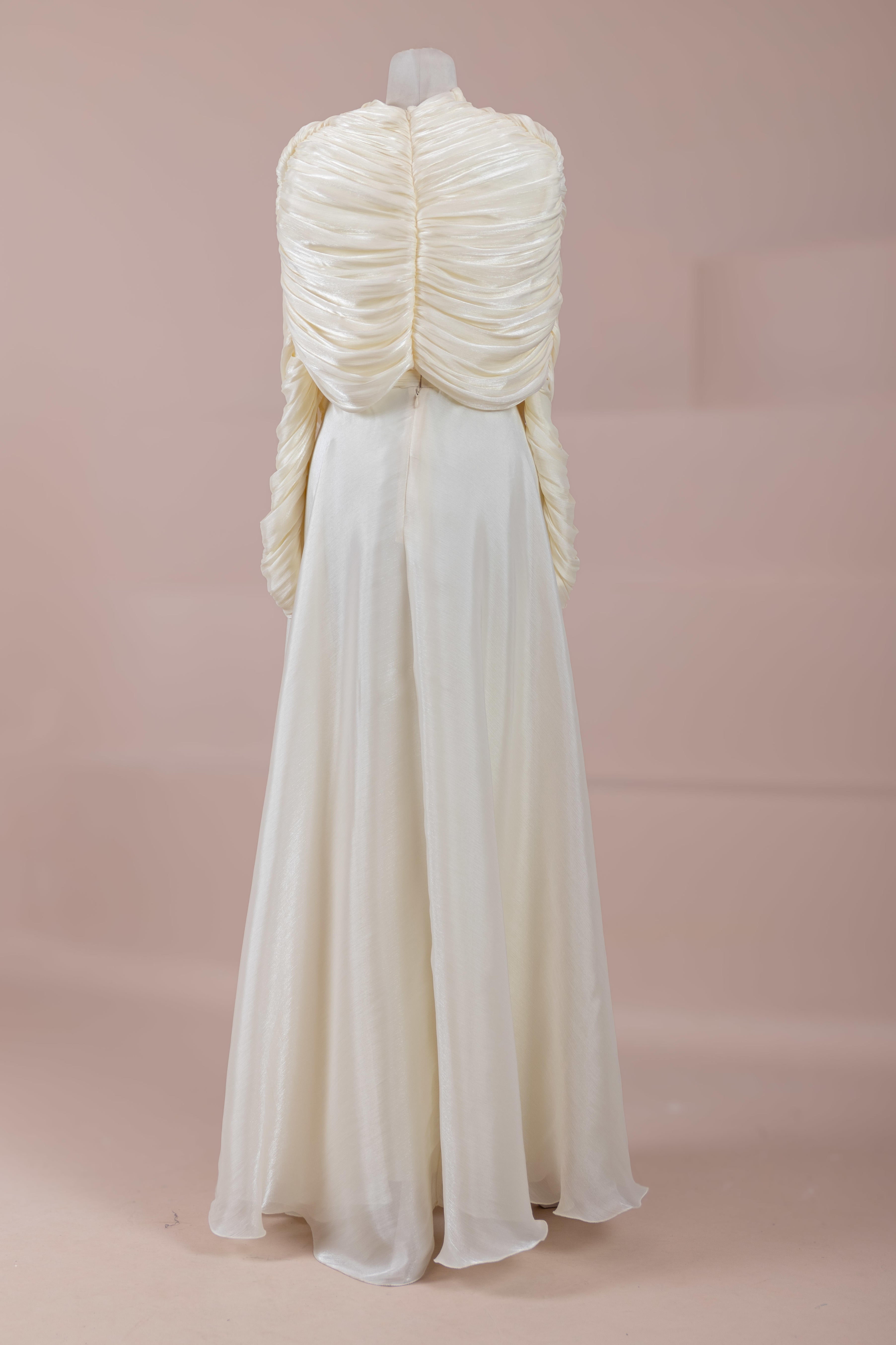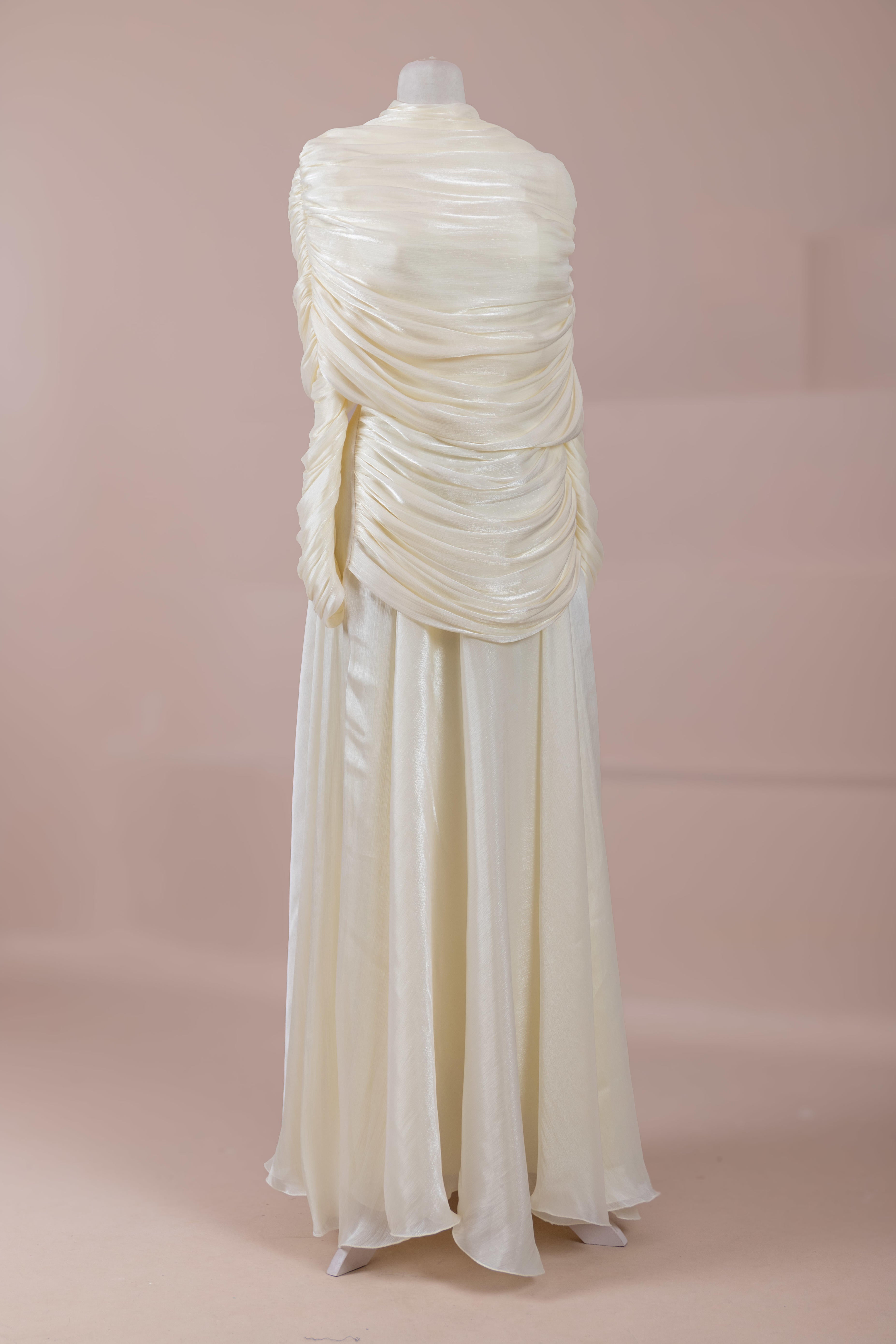 Das Modell hat eine zweilagige Konstruktion. Das Innenkleid ist in einer glatten und fließenden A-Linien-Form gestaltet; die Taille sitzt leicht anliegend, der Rockteil weitet sich natürlich zum Boden hin und erzeugt eine ausgewogene Silhouette. Das drapierte Teil im oberen Bereich beginnt an der Schulter und umschließt Rücken- und Brustbereich. Die Drapierungen sind horizontal und diagonal angeordnet, geben Volumen und sorgen für einen kontrollierten Fall, ohne die Form zu zerstören. Die Ärmellänge ist lang und reicht bis zum Handgelenk. Die Gesamtstruktur ist nach dem Prinzip eines vertikalen Flusses gestaltet, der den Körper länger und eleganter erscheinen lässt.