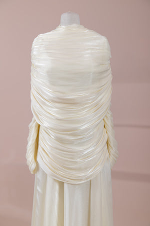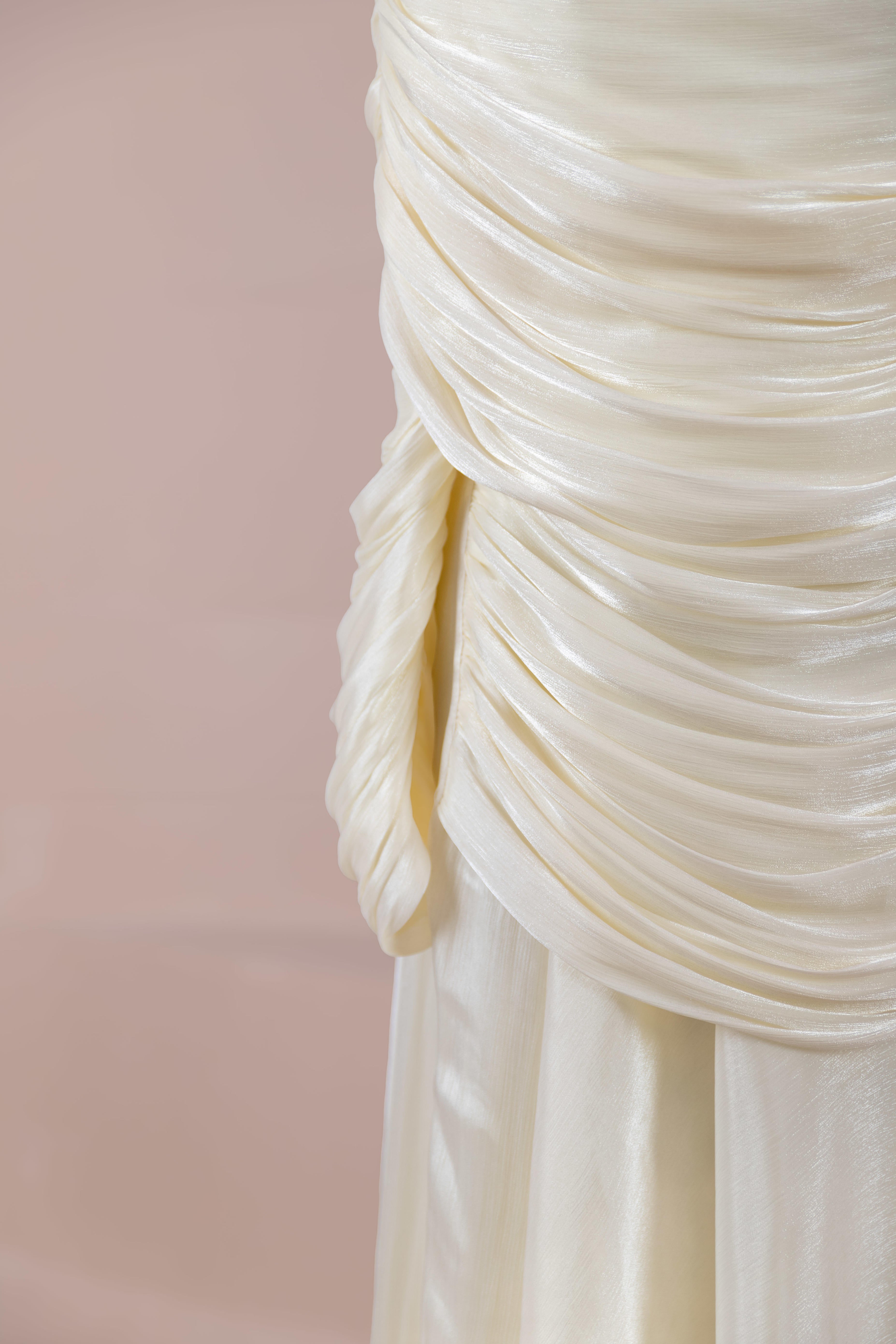 Die obere Schicht besteht aus leichtem, halbtransparentem und fließendem Chiffon-/Krepp-ähnlichem Stoff. Sie ist weich genug, um die Drapierung zu tragen, aber stabil genug, um die Form zu bewahren. Das Innenkleid ist aus einem dichter gewebten, undurchsichtigen, fließenden Stoff gefertigt; dadurch bleibt die Silhouette klar und es gibt keine Durchsicht. Die Stoffoberfläche reflektiert leicht das Licht und verleiht Tiefe. Atmungsaktiv und zeigt im Bewegungsablauf einen natürlichen Fluss.