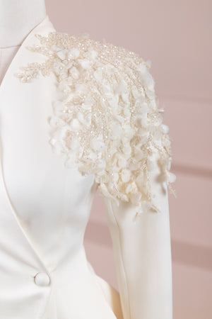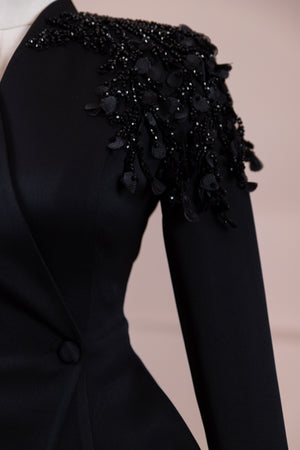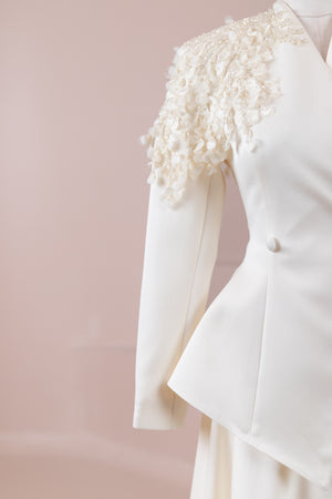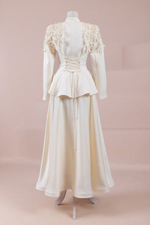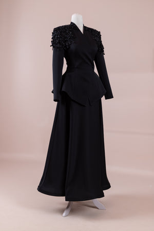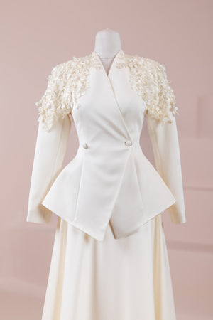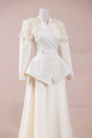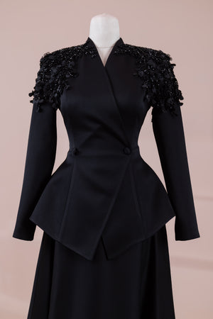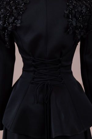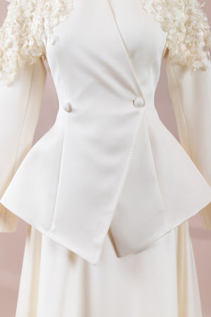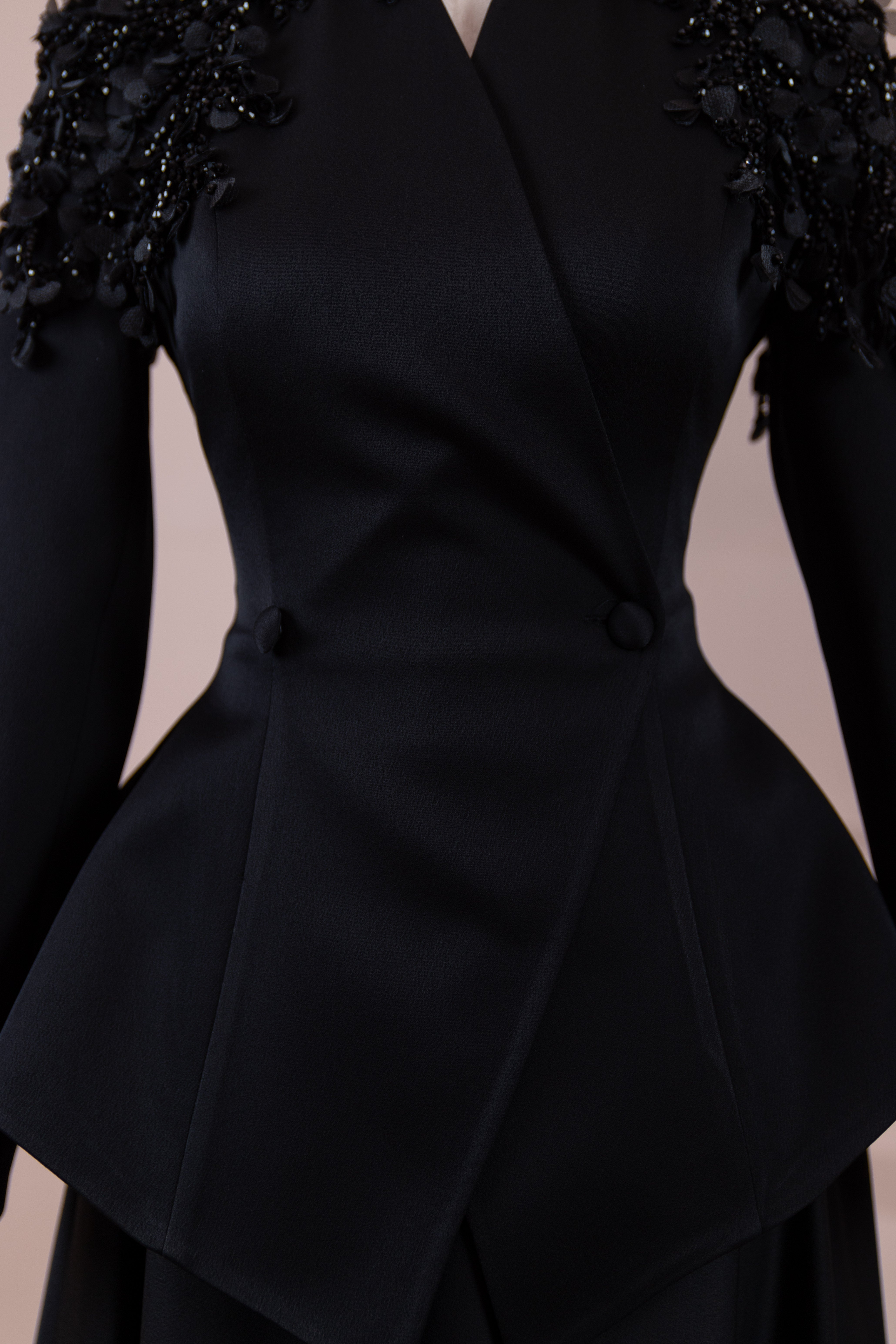 • Saum (Oberteil): Asymmetrischer, gebrochener Saum in Peplum-Form.