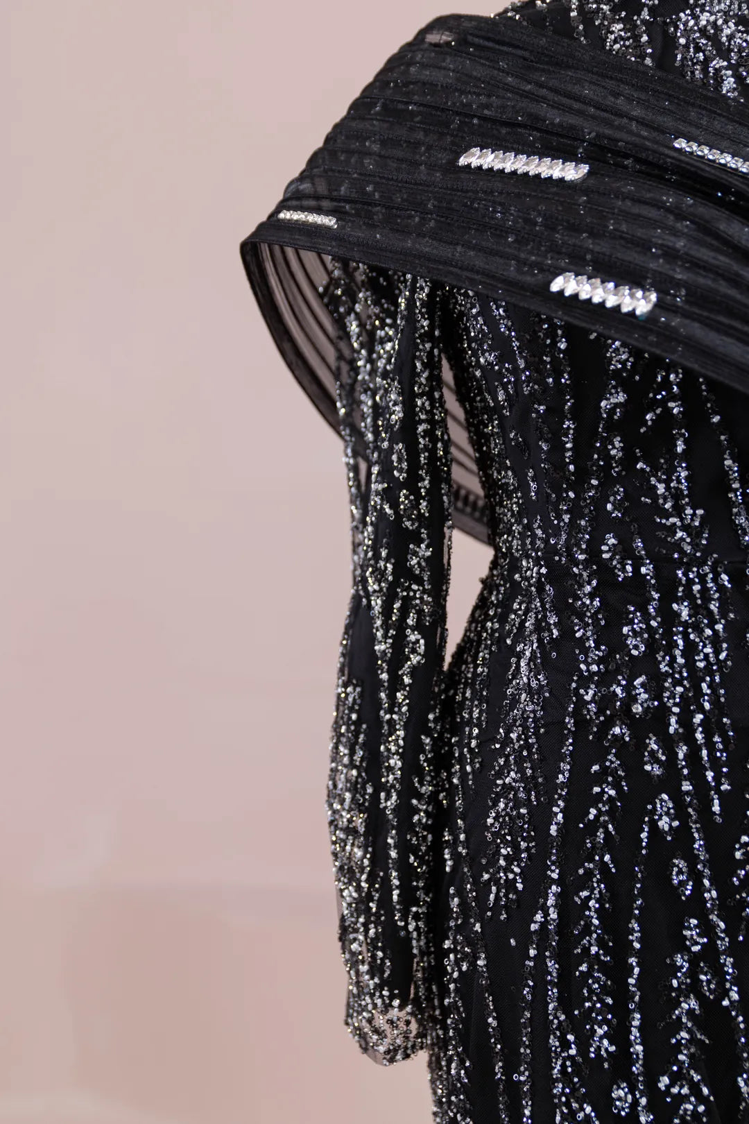 - Schnitt: Fisch, einseitig drapierte Schulter. Hoher Kragen; modernes, elegantes Aussehen